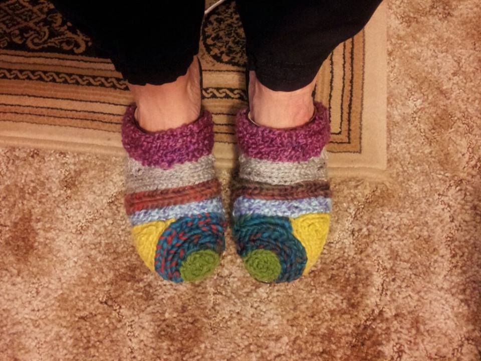 A pair of Born black leather clogs covered in crocheted yarn. Inspired by an enhanced picture of an ocellated turkey found on Google.