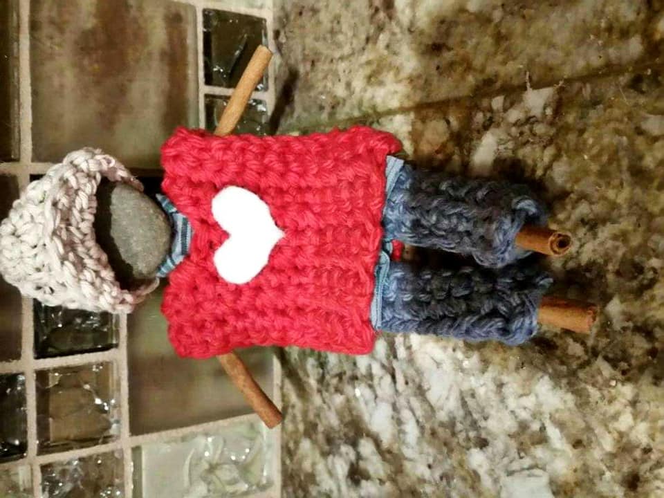 This Barbling is a decorative, art doll that I made and gave to my great grandniece, Melodie. I also crocheted a blanket to wrap her in. Her mommy knows that Sticks and Stones Barblings are not toys –(I had visions of Melodie poking her eye out with the stick arms or legs so I ‘dulled’ them before gifting her the doll). I put her in a wood cigar box that belonged to her great grandfather. She carried the same message as Daniel’s doll.