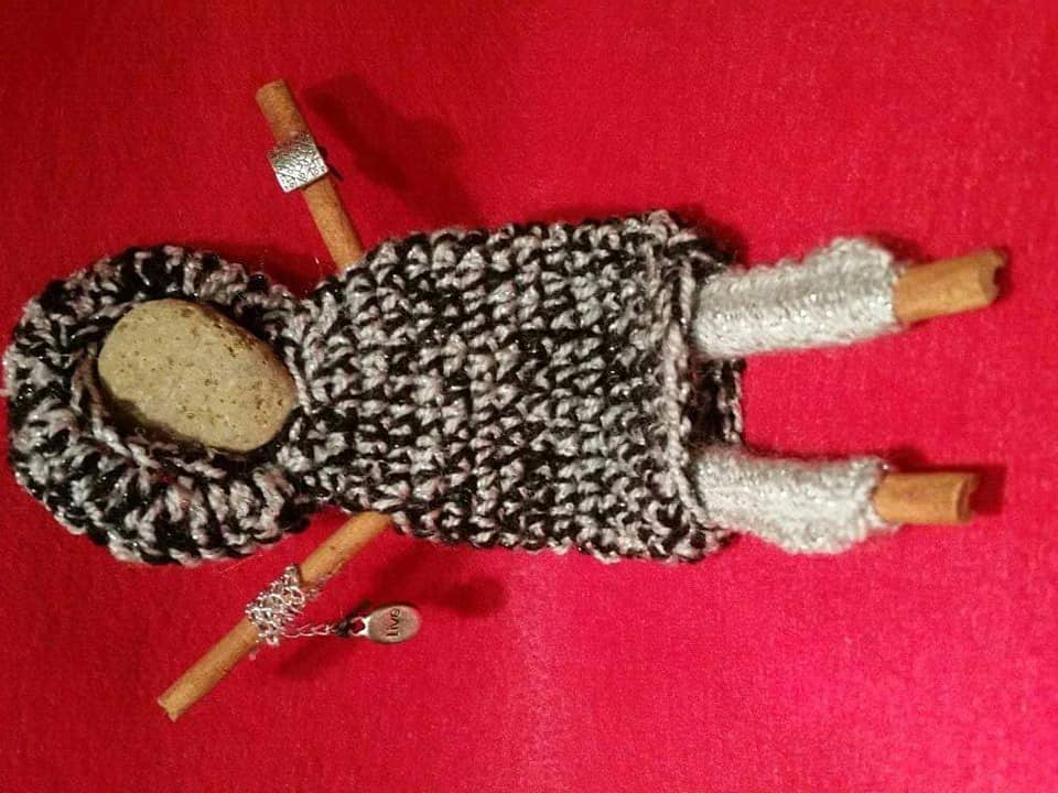 This Sticks and Stones Barbling went to my grandnephew, Daniel. He was struggling at school and was being bullied. The shirt that this Barbling is wearing under the crocheted vest–is a piece of my mother’s blouse. She was a woman who had to overcome many obstacles; she was very courageous and I hoped that some of her strength would find its way to Dan. The message that this Barbling carried: